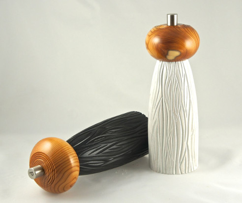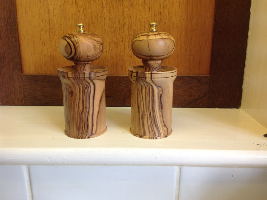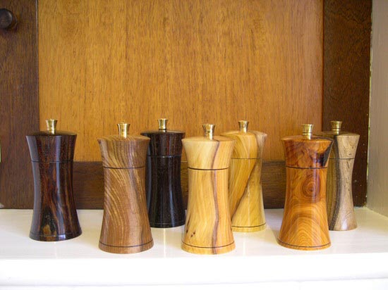 Pepper & Salt mills in Jarrah on Mallee burr base, mustard pot of Jarrah, lined with Boxwood with Ebony finial. Fitted with Cole & Mason fittings. not available |
